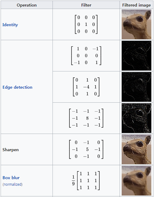 필터링은 이미지 처리 분야에서 광범위하게 이용되고 있는 기법으로써, 이미지에서 테두리 부분을 추출하거나 이미지를 흐릿하게 만드는 등의 기능을 수행하기 위해 이용된다. 필터의 예시는 아래 표와 같다. 행렬로 표현된 이미지에 원하는 필터를 합성곱(convolution) 하면 결과로 오른쪽 사진이 나온다.