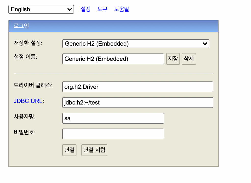4. 연결 버튼을 누른다. 위에 JDBC URL에 적혀있는 것은 ~/test 폴더에 파일을 만든다는 의미이다. 처음에만 그렇게 들어가고 이후부터는 해당 부분에 jdbc:h2:tcp://localhost/~/test 라고 적어줘야한다.