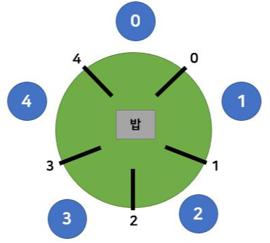 - 만약 0번 철학자가 4번 젓가락을 사용하게 되면 4번 철학자는 식사를 할 수 없어 0번 철학자가 식사를 마칠때까지 기다려야한다.