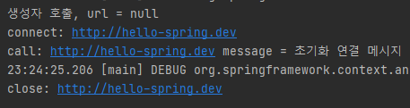 처음에 LifeCycleConfig를 통해 스프링 빈이 등록되면서 NetworkClient 빈의 생성자가 실행된다. 그러면서 아래와 같이 출력된다.