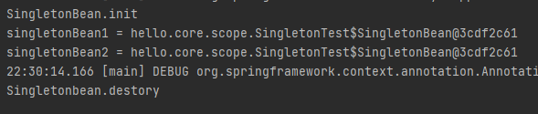 여기서 알 수 있는 점은 해당 빈이 싱글톤 스코프이기 때문에 getBean 할때마다 같은 인스턴스의 빈이 반환되어서 같은 빈이 ...@3cdf2c61 이렇게 출력이 되었다는 점이고, 같은 빈이기 때문에 생성도 처음에 1번만 되어서 처음에만 SingletonBean.init이 호출된다는 점이다. 마찬가지로 Singletonbean.destory도 한번만 호출된다.
