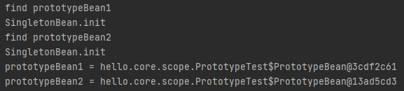 여기서는 빈이 같은 인스턴스가 반환되는게 아니기 때문에 SingletonBean.init도 두번 호출되고, 두개의 빈이 주소값도 다른 것을 알 수 있다. 또한 여기서는 destory 메서드가 호출되지 않았는데 이는 프로토타입 스코프의 경우 스프링 컨테이너가 초기화 후 이후 관리를 하지 않기 때문이다.