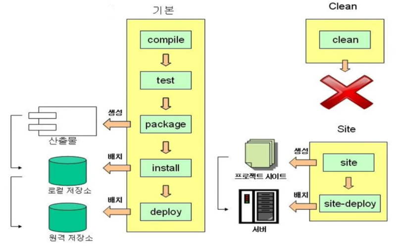 큰 틀은 default(기본, 프로젝트 빌드 및 배포), clean(이전 빌드에서 생성된 파일들을 삭제), site(프로젝트 사이트를 생성) 이고 각각은 세부적인 Phase들로 이루어져있다.