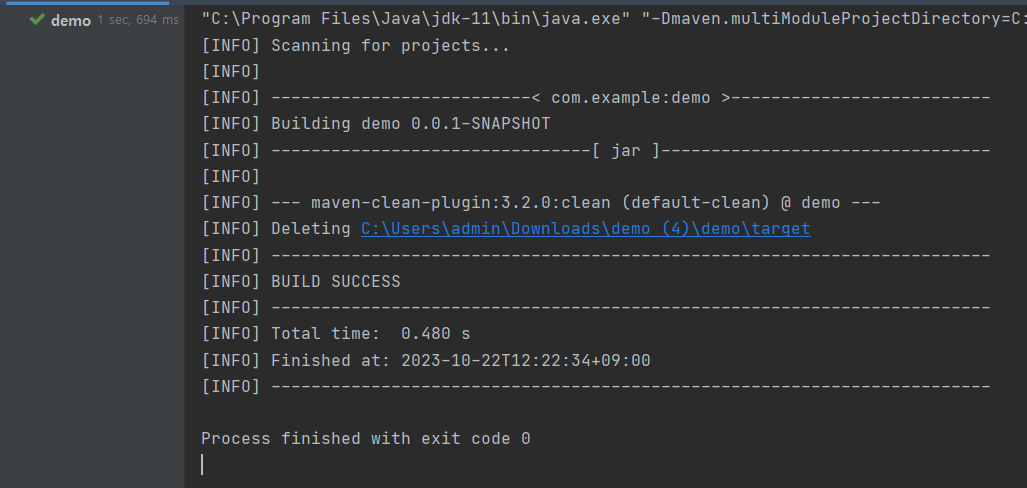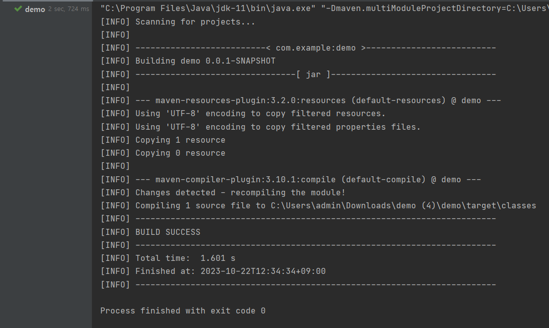 2023-10-22 12:38:37.561 INFO 7384 --- [ main] com.example.demo.DemoApplicationTests : Starting DemoApplicationTests using Java 11 on DESKTOP-THAI4MF with PID 7384 (started by admin in C:\Users\admin\Downloads\demo (4)\demo)
