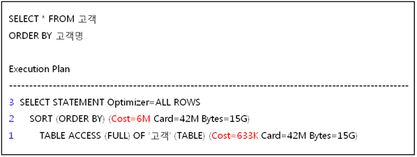 이 플랜에서는 고객 테이블을 FULL SCAN을한 뒤에 SORT를 하는데, 차례대로 633K -> 6M 만큼의 비용을 발생시킨다. 우리는 여기서 조건절의 인덱스 유무도 중요하지만 소팅도 튜닝에서 중요한 요소임을 알 수 있다.