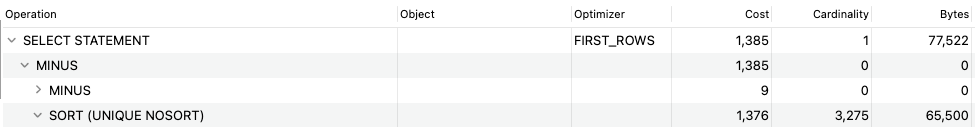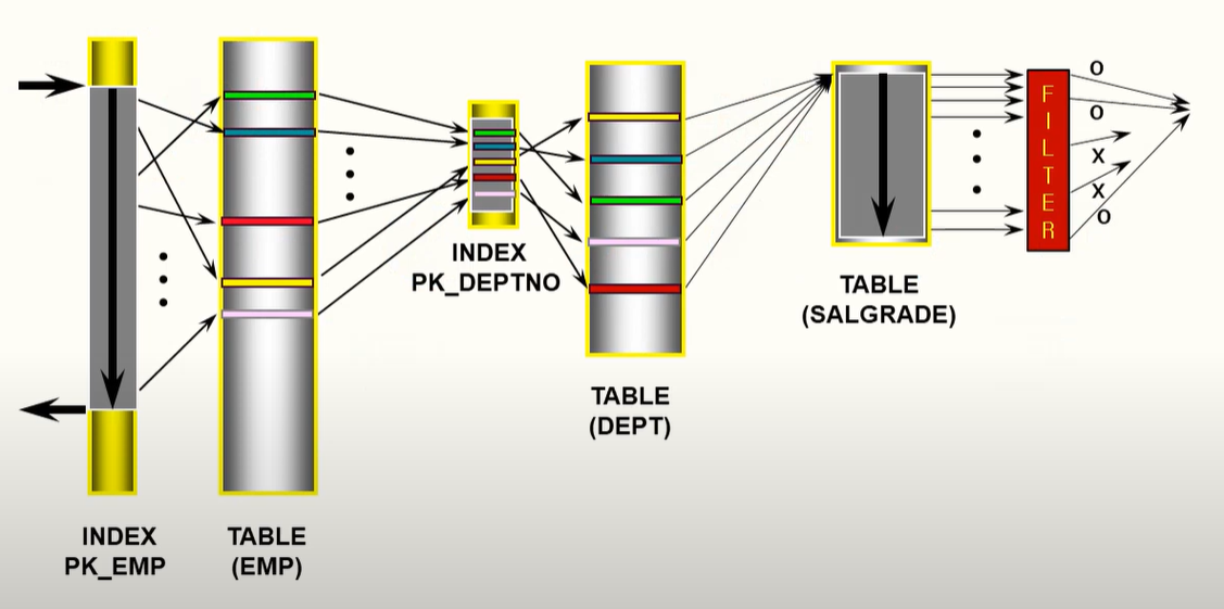 툴을 확인하거나 "Explain plan for"를 쿼리 앞단에 붙여서 실행계획을 떠보면 위와 비슷한 형식으로 나온다. (툴별로 조금씩 다를 수 있음)