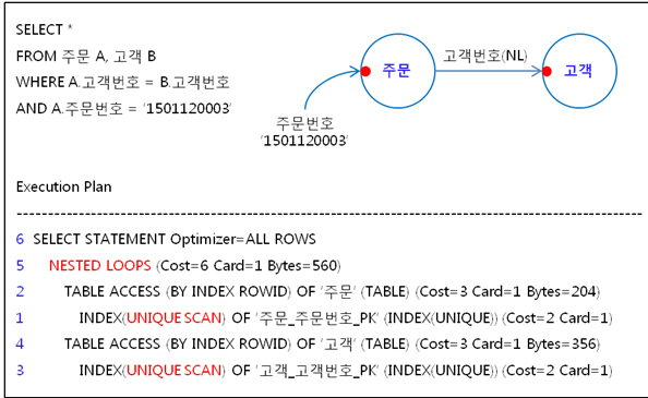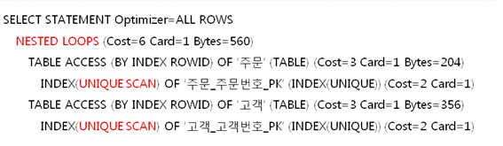 주문 테이블의 주문번호는 인덱스가 걸려있어 INDEX(UNIQUE SCAN)을 하고 있지만 고객 테이블에서는 고객 번호에 인덱스가 없어 TABLE ACCESS (FULL) 로 풀스캔을 하고 있음을 알 수 있다. 그런데 여기서 Card=1이라는 값으로 고객번호가 UNIQUE 함을 알 수 있고, 고객번호 컬럼을 인덱스로 생성해야 함을 알 수 있다.
