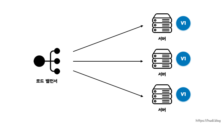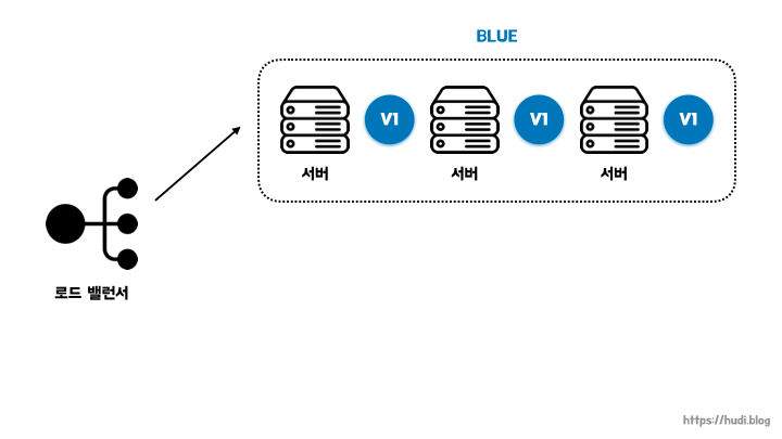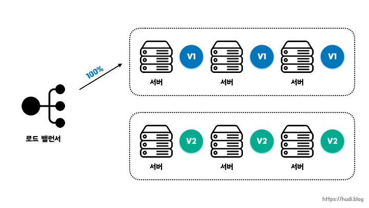 블루-그린 배포는 운영 환경에 구버전과 동일하게 신버전의 인스턴스들을 구성한 뒤, 로드밸런서를 통해 신버전으로 일괄로 트래픽을 전환하는 배포 방식이다. 현재 운영중인 서비스의 환경을 블루, 신버전을 그린이라고 부른다.