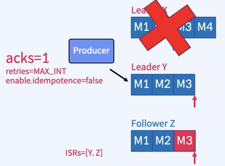 Leader X가 장애나기 전에 Producer는 M4에 대한 ack를 이미 받았을 것임(acks=1)