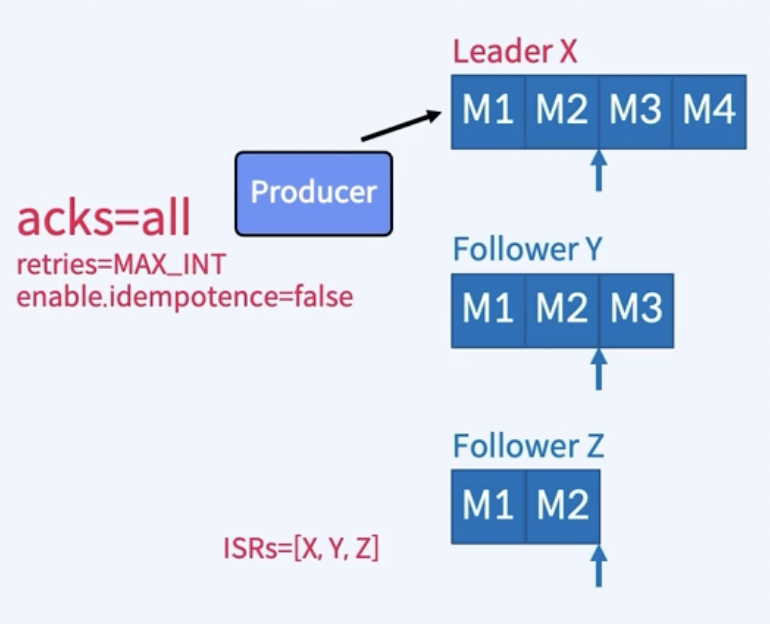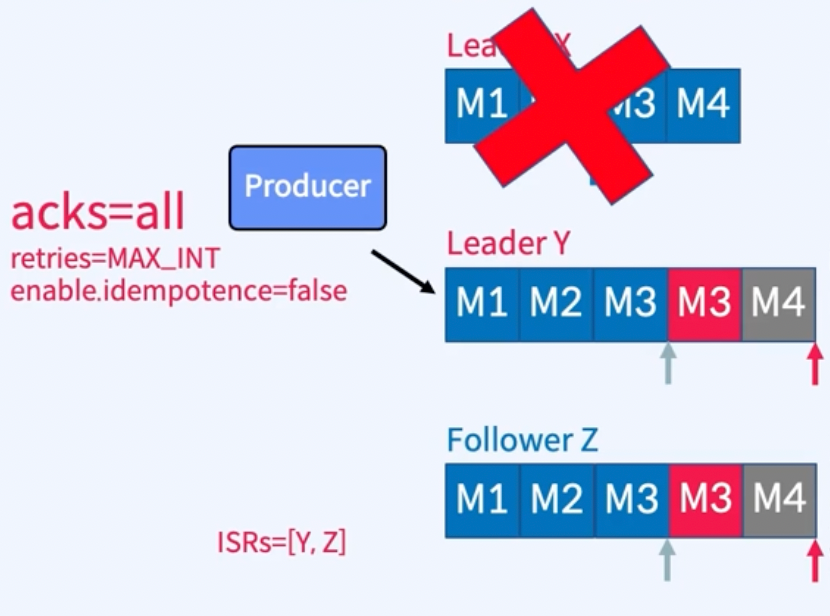 Producer는 M3, M4에 대한 ack를 받지 못했으므로 M3, M4를 Y로 다시 보냄.