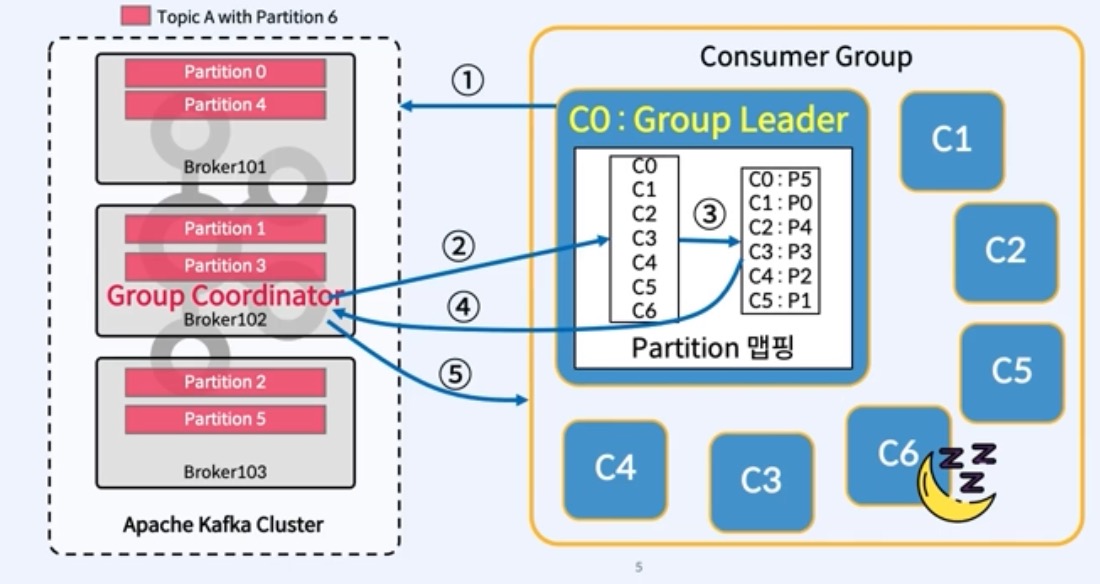 Consumer가 어떤 partition을 할당할건지 Group Coordinator와 Group Leader가 상호작용하며 관리됨