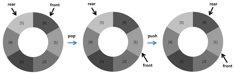 (2) 환형 큐(circular queue) : 선형 큐의 문제점을 보완한 것이 환형 큐. front가 큐의 끝에 닿으면 큐의 맨 앞으로 자료를 보내어 원형으로 연결 하는 방식이다. 원형 큐라고도 한다.